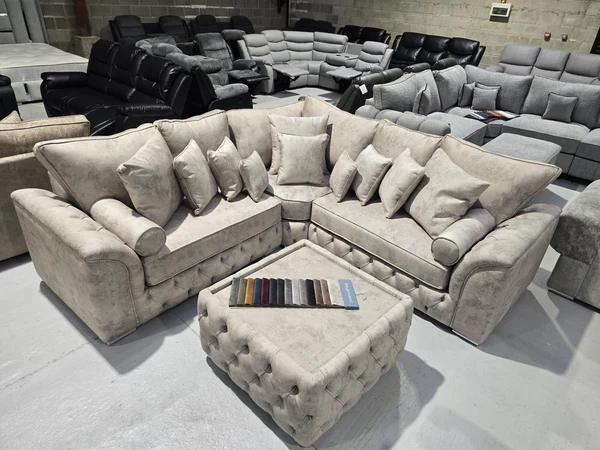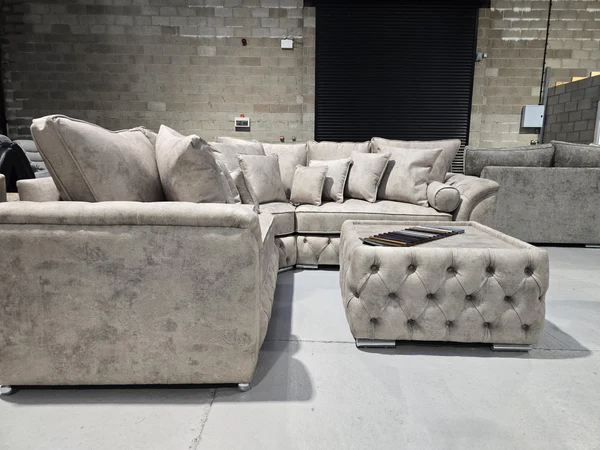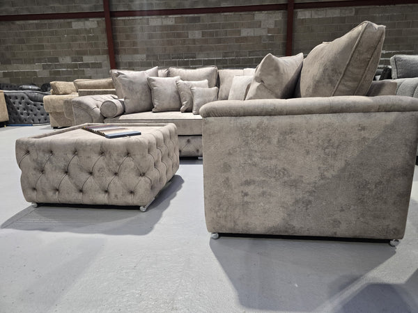 Malibu Chesterfield Corner Sofa – Stone Daytona Fabric with Silver Trims | Best Sofa Hub